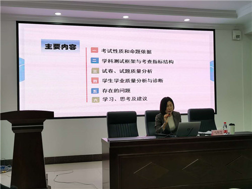 本次活動由市研訓教師馬智慧主持并主講。馬老師主要從考試性質(zhì)和命題依據(jù)、學科測試框架與考查指標結(jié)構(gòu)、試卷及試題質(zhì)量分析、學生學業(yè)質(zhì)量分析與診斷等方面對2020中考學業(yè)質(zhì)量進行了反饋。通過對測試數(shù)據(jù)的深入分析,探尋教學中存在的問題,切中要害,直指問題。如何解決教學中出現(xiàn)的問題,馬老師認為研訓教師及一線教師需要進一步更新觀念,加強學習。本次研訓活動中,馬老師引領(lǐng)參會教師共同學習了中共中央、國務(wù)院下發(fā)的《關(guān)于深化教育教學改革全面提高義務(wù)教育質(zhì)量的意見》、《深化新時代教育評價改革總體方案》和教育部下發(fā)的《關(guān)于加強初中學業(yè)水平考試命題工作的意見》等文件,并結(jié)合大連實際情況,對新學期教學給出了科學、合理的建議。
