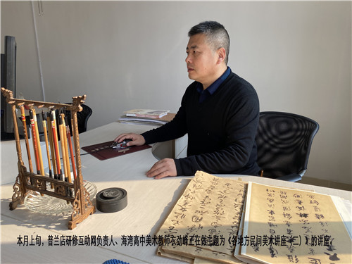 講座前普蘭店地區(qū)美術(shù)學(xué)科負(fù)責(zé)人海灣高中美術(shù)教師衣勁峰做了充分的備課和準(zhǔn)備工作。衣老師首先介紹了普蘭店地區(qū)民間美術(shù)的基本狀況、當(dāng)?shù)孛耖g美術(shù)的類(lèi)型和發(fā)展歷史,運(yùn)用對(duì)比的方法重點(diǎn)講述了當(dāng)?shù)孛耖g美術(shù)的地域性特征,強(qiáng)調(diào)美術(shù)教育工作者要通過(guò)課題美術(shù)教學(xué)向?qū)W生講授民間美術(shù)內(nèi)容的質(zhì)樸、藝術(shù)形式的獨(dú)特,以此提高民間美術(shù)的傳承意識(shí)。