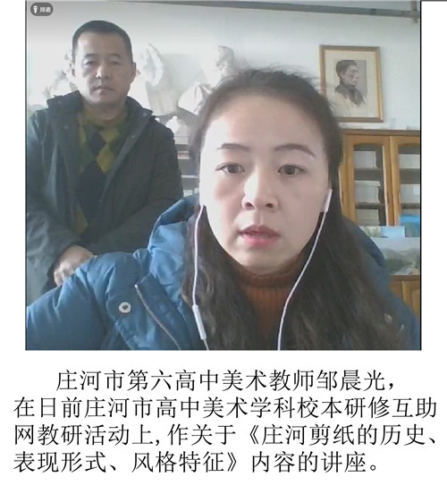 依據(jù)本次主題內(nèi)容,以新教材第9課《美在民間——中國民間美術(shù)》中的剪紙內(nèi)容為基礎(chǔ),以莊河市著名民間剪紙傳承人韓月琴老師剪紙的風(fēng)格與特色為核心,都基田老師內(nèi)容為“莊河人的生活與莊河人的剪紙創(chuàng)作”,他認(rèn)為:剪紙始終伴隨著隨著農(nóng)耕文明的發(fā)展而存在著,由于工業(yè)文明的發(fā)展又面臨生存和發(fā)展的問題,莊河人所做的努力-----除了傳承人的付出以外,廣大剪紙藝術(shù)愛好者和活躍在教育一線的教師們也做出了積極的貢獻(xiàn)莊河市六高中鄒晨光老師的主講內(nèi)容是剪紙的歷史、表現(xiàn)形式、派別,邊講授、邊與教師分享自己創(chuàng)作剪紙的小視頻。