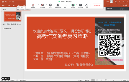 受疫情影響,11月份高中語文備考策略研訓活動仍然在線上開展。11月9日下午,高中研訓中心語文學科組研訓教師宋亞科利用騰訊會議組織了高中語文備考策略研訓活動,活動的主題是“高考作文備考策略觀摩與交流”。