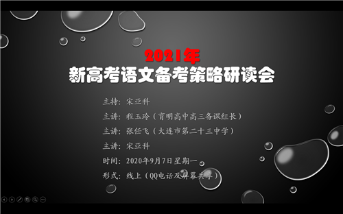 受疫情影響,2021屆9月份高中語(yǔ)文備考策略研訓(xùn)活動(dòng)仍然在線上開(kāi)展。9月7日下午,高中研訓(xùn)中心語(yǔ)文學(xué)科組研訓(xùn)教師宋亞科老師在“大連高三教師(2021)”QQ群組織了2021屆9月份高中語(yǔ)文備考策略研訓(xùn)活動(dòng),活動(dòng)的主題是大連市新高考語(yǔ)文備考策略交流與指導(dǎo)。