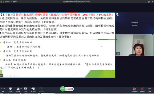 為了有效地引領(lǐng)教師把握復(fù)習(xí)的設(shè)計(jì)思路,明確生物學(xué)科核心素養(yǎng)如何在課堂上落地,進(jìn)一步了解我省生物學(xué)科選擇性考試的考試范圍,本次活動(dòng)安排了三方面內(nèi)容:首先由36中的楊穎老師以《免疫調(diào)節(jié)》為題上了一節(jié)基于生物學(xué)科核心素養(yǎng)的高三生物一輪復(fù)習(xí)研討課,楊老師以“新冠疫苗”的情境導(dǎo)入,串聯(lián)全課的三個(gè)主要學(xué)習(xí)任務(wù),通過(guò)師生互動(dòng)、生生互動(dòng),講練結(jié)合,最后有效地達(dá)成了學(xué)生“學(xué)會(huì)知識(shí)、學(xué)會(huì)構(gòu)建、學(xué)會(huì)表述、學(xué)會(huì)應(yīng)用”的教學(xué)目標(biāo)。隨后,金州高中的周雙艷老師以《植物的激素調(diào)節(jié)》為課例做了“基于學(xué)科核心素養(yǎng)的課堂教學(xué)設(shè)計(jì)及實(shí)施”的專(zhuān)題講座,周老師從《普通高中生物學(xué)課程標(biāo)準(zhǔn)(2017年版)》對(duì)此課的要求、學(xué)生的課前自主學(xué)習(xí)單、課中的知識(shí)梳理、構(gòu)建知識(shí)網(wǎng)絡(luò)、重難點(diǎn)突破、能力提升方案、對(duì)點(diǎn)練習(xí)題四個(gè)方面對(duì)該課的復(fù)習(xí)設(shè)計(jì)及其意圖做了詳盡的分析,讓老師們體驗(yàn)了該校高三備課組在如何啟發(fā)學(xué)生思維、培養(yǎng)學(xué)生的探究能力、課前預(yù)習(xí)與課堂實(shí)施如何銜接、如何創(chuàng)設(shè)問(wèn)題情境等方面所做的努力。最后大連教育學(xué)院高三生物研訓(xùn)教師王潔從六個(gè)方面做了“基于生物學(xué)科核心素養(yǎng)的高三生物備考策略”的專(zhuān)題講座,在講座中她著重對(duì)2021年生物學(xué)科選擇性考試備考復(fù)習(xí)的綱領(lǐng)性文件——《普通高中生物學(xué)課程標(biāo)準(zhǔn)(2017年版)》及遼寧省高考范圍做了詳細(xì)的解讀,解了老師們的疑惑,讓老師們的高考生物復(fù)習(xí)方向更明、思路更清晰。