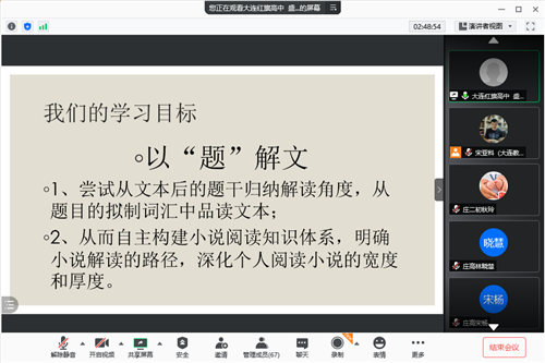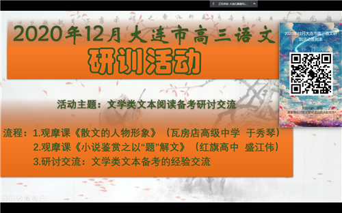 活動包括三個方面的內(nèi)容,首先活動播放了瓦房店高級中學(xué)高三備課組長于秀琴老師錄制的視頻觀摩課《散文的人物形象》,課堂上于老師從教材上的《小狗包弟》開始,結(jié)合散文中人物形象的特點,與學(xué)生一起歸納了總結(jié)人物形象特點時注意的四個方面,并且對總結(jié)的方法進(jìn)了較為有效的指導(dǎo)。然后播放了紅旗高中備課組長盛江偉老師錄制的視頻觀摩課《小說鑒賞之以“題”解文》,盛老師的課以群文閱讀為載體,將10篇小說閱讀中的題目從小說的主題、人物、情節(jié)和環(huán)境等方面與學(xué)生共同進(jìn)行了研討式的總結(jié),整個課堂中,教師文本細(xì)讀與方法的指導(dǎo),尤其是學(xué)生在課堂中思維的發(fā)散性得到了很好的體現(xiàn)。老師們在線進(jìn)行了觀摩。接著,兩位上課老師分別對所上的課進(jìn)行了課堂教學(xué)的說明與反思,以此形式將本校備考中文學(xué)類文本閱讀的備考策略進(jìn)行了交流。最后,研訓(xùn)教師宋亞科對整個活動進(jìn)行了簡單的總結(jié),在總結(jié)中,他肯定了規(guī)范的方法指導(dǎo)型課堂與思維發(fā)散式課堂的做法,并提出了要逐漸在一輪復(fù)習(xí)末期要適當(dāng)增加對文學(xué)文本行文特征的把握,提出命題課的復(fù)習(xí)課類型。