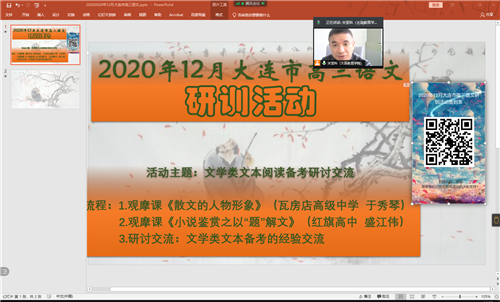 受疫情影響,12月份高中語文備考策略研訓(xùn)活動仍然在線上開展。12月14日(星期一)下午,高中研訓(xùn)中心語文學(xué)科組研訓(xùn)教師宋亞科利用騰訊會議組織了高中語文備考策略研訓(xùn)活動,活動的主題是“文學(xué)類文本閱讀備考研討交流”。