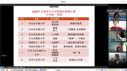 德育心理研訓(xùn)中心心理室主任周茹宣讀了2020年大連市校園心理劇評選結(jié)果以及參評2019年遼寧省第二屆“華育杯”中小學(xué)校園心理劇獲獎結(jié)果。與會者線上觀摩三部優(yōu)秀校園心理劇:大連市中山區(qū)東港第一小學(xué)《疫路發(fā)現(xiàn)愛》,莊河步云山鄉(xiāng)中心小學(xué)《溝通讓愛流動》和大連市第39中學(xué)《二胎你好》。大連教育學(xué)院德育心理研訓(xùn)中心主任李玉榮對本年度校園心理劇大賽總結(jié)并做專家點(diǎn)評。李玉榮主任從校園心理劇的本質(zhì)內(nèi)涵、選題、劇情架構(gòu)、技術(shù)應(yīng)用以及視頻錄制五個(gè)方面進(jìn)行專業(yè)點(diǎn)評與培訓(xùn),既有理論指導(dǎo)又有具體操作的要點(diǎn),使得廣大教師對校園心理劇有了進(jìn)一步的深刻認(rèn)識,并可以有效將這些具體要點(diǎn)應(yīng)用在校園心理劇的創(chuàng)作、編排以及錄制過程中。