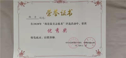 為大力宣傳我市持續(xù)加強(qiáng)離退休干部服務(wù)管理,引導(dǎo)老同志發(fā)揮正能量的經(jīng)驗(yàn)和疫情防控期間涌現(xiàn)出來的一批老同志先進(jìn)典型。2020年11月至12月,市委老干部局聯(lián)合《中國(guó)老年》雜志社開展了“我是最美志愿者”評(píng)選活動(dòng),經(jīng)個(gè)人申報(bào)、學(xué)院推薦,我院退休教授鄭力榮獲大連市“我是最美志愿者”優(yōu)秀獎(jiǎng)稱號(hào),離退休干部處獲優(yōu)秀組織獎(jiǎng)。