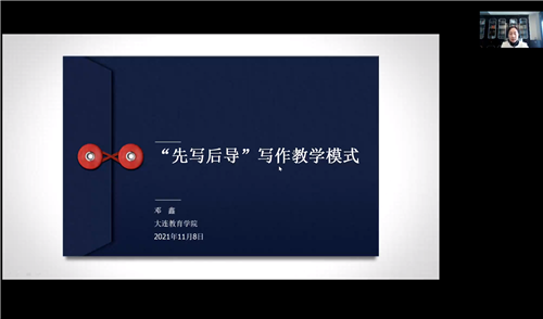 學院初中語文研訓教師鄧鑫主持本次活動。鄧老師首先簡短地介紹了活動的背景及目標,然后播放了大連理工大學附屬學校楊起帆老師以“巧遷妙移推陳出新”為題的作文教學錄像課。楊老師的這節(jié)課,充分展現(xiàn)了“先寫后導”的作文教學模式:教師預設教學目標,下發(fā)寫作任務——學生完成寫作任務——教師根據(jù)習作的主要問題確定教學內(nèi)容,選擇教學策略——教師進行課堂教學點撥,學生習得技能——教師引導學生自評、互評、自改——教師展評。接著,鄧老師結合這節(jié)課、近幾年作文教學團隊教學實踐中的部分典型案例以及省課題成果《初中語文寫作學案》,從“什么是‘先寫后導’”“為什么要‘先寫后導’”“怎樣實施‘先寫后導’”三大方面,對“先寫后導”作文教學模式做了深入淺出的詮釋,同時強調(diào)作文教學要重視學生寫作實踐、要基于學生已具有的寫作知識能力和經(jīng)驗確定教學內(nèi)容、要重視學生寫作過程中程序性知識教學,從而提升寫作教學的針對性、實效性。