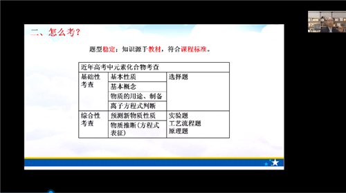 活動第三部分是東北育才學(xué)校郝俊剛老師做的《核心素養(yǎng)下的元素化合物復(fù)習(xí)》的講座。郝老師從怎么考?考什么?怎么教?等層面分析了本部分內(nèi)容如何備考,指出了幾個(gè)重點(diǎn)復(fù)習(xí)內(nèi)容與方向,并建議各位老師作一個(gè)懂得取舍的老師。