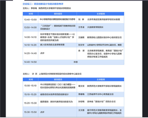 分論壇以“項目創(chuàng)新設(shè)計與培訓績效考評”,由陜西師范大學教師干部培訓學院院長李鐵繩、上海師范大學教育學院現(xiàn)代校長研修中心副主任許蘇主持,來自北京海淀區(qū)教師進修學校、教育部幼兒園園長培訓中心、江蘇省師干訓中心等8家單位的培訓同仁作了經(jīng)驗分享。北京教育學院余新教授、南寧師范大學教師教育學院王文蓉副院長分別作了專家點評。
