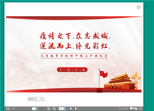 11月22日,恰逢“小雪”節(jié)氣來(lái)臨之際,突如其來(lái)的新冠疫情讓全市進(jìn)入了抗擊疫情的至關(guān)緊要狀態(tài),全校師生又開(kāi)啟了居家線上教與學(xué)模式,“教師離校不離教,學(xué)生停課不停學(xué)”。在這個(gè)十分特殊時(shí)段,為了進(jìn)一步加強(qiáng)愛(ài)國(guó)主義教育,堅(jiān)定戰(zhàn)勝疫情的信心和決心,學(xué)院附中通過(guò)樂(lè)課網(wǎng)的在線校園課堂平臺(tái)舉行了一次別開(kāi)生面的“線上升旗儀式”,升旗活動(dòng)的主題為“疫情之下,眾志成城,逆流而上,終見(jiàn)彩虹”。學(xué)校黨支部書(shū)記林杉做了升旗主旨講話,團(tuán)委書(shū)記王藝燁主持儀式,全校師生居家通過(guò)平板、電腦、手機(jī)等,同一時(shí)間集聚云端,參加了這一特殊時(shí)期的神圣而莊嚴(yán)的升旗儀式。