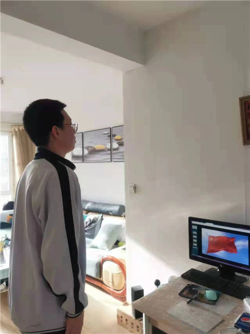 上午8:45,線上升旗儀式正式開(kāi)始,伴隨著雄壯的國(guó)歌聲響起,屏幕里的鮮艷的五星紅旗徐徐升起,全體師生居家肅然而立,向國(guó)旗行注目禮。