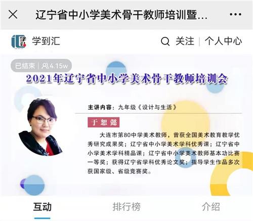 2021年11月14日—11月19日,遼寧省美術(shù)學(xué)科骨干教師培訓(xùn)暨美術(shù)教研核心團(tuán)隊(duì)項(xiàng)目推進(jìn)會(huì)在“學(xué)到匯”平臺(tái)如期舉行。此次活動(dòng)由遼寧省教育廳主辦,遼寧教育學(xué)院承辦,全省約4.15萬中小學(xué)美術(shù)教師參與線上學(xué)習(xí)觀摩。大連初中美術(shù)在此次活動(dòng)中受邀參加研訓(xùn)教師專題交流、一線教師課堂教學(xué)展示及教學(xué)專題評(píng)價(jià)研討。