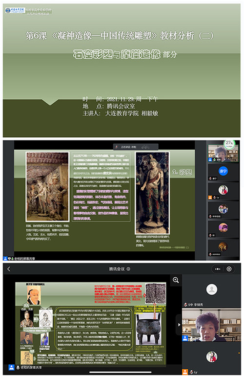 繼10月主題“中外雕塑作品”單元教材教法探究研訓活動之后,本月29日大連市高中美術繼續(xù)主題為《凝神造像——中國傳統(tǒng)雕塑》(二)的研訓活動,學院高中研訓中心相毅敏主講并主持了本月研訓活動,活動地點騰訊會議。高一高二美術教師65人參加了研訓活動。
