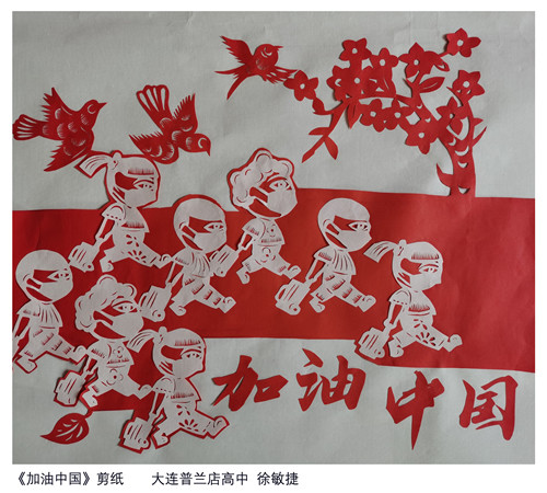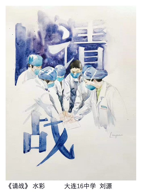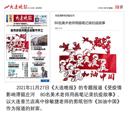 在大連大學(xué)美術(shù)學(xué)院石峰院長(zhǎng)專(zhuān)業(yè)引領(lǐng)和親自?huà)鞄浵拢咧忻佬g(shù)老師積極投入到戰(zhàn)疫主題的美術(shù)創(chuàng)作中。封閉出不去就將宿舍當(dāng)畫(huà)室,不能對(duì)景寫(xiě)生就將手機(jī)里拍照的圖片作素材,每天的戰(zhàn)疫新聞激發(fā)創(chuàng)作熱情與創(chuàng)作靈感。大連16中劉源老師創(chuàng)作了水彩畫(huà)《請(qǐng)戰(zhàn)》;普蘭店高中徐敏捷老師創(chuàng)作的剪紙作品《加油中國(guó)》,該創(chuàng)作在11月27日《大連晚報(bào)》的《80名美術(shù)老師用畫(huà)筆記錄抗疫故事》報(bào)道中作為封面。在主題創(chuàng)作同時(shí),高中美術(shù)老師發(fā)揮藝術(shù)想象力,創(chuàng)作出以莊河秀美山川為主題的中國(guó)畫(huà)、油畫(huà)、水彩畫(huà)等藝術(shù)形式的美術(shù)作品共計(jì)70余幅。