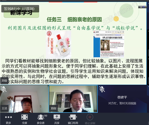 此次線上活動主要安排了兩大方面內(nèi)容:首先由大連市旅順中學(xué)的劉俊老師作為基礎(chǔ)教育精品課省級優(yōu)課二等獎獲得者進行了基于核心素養(yǎng)的高中生物學(xué)學(xué)科精品課——必修1第6章第3節(jié)細胞的衰老和死亡一課的展示,隨后劉俊老師以“精品課設(shè)計思路與心得體會”為題,從設(shè)計思路、精品課準備、精品課體會和線上教學(xué)做法四個方面進行了說課和經(jīng)驗分享。隨后大連教育學(xué)院的高中生物學(xué)學(xué)科的研訓(xùn)教師王潔老師根據(jù)其參加評比的經(jīng)驗,并結(jié)合大連市獲得省級一等獎選手的經(jīng)驗教訓(xùn)做了“2021年普通高中精品課設(shè)計及上傳需要注意的問題”的專題講座。