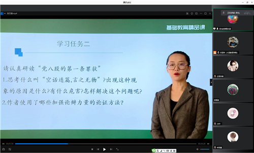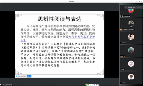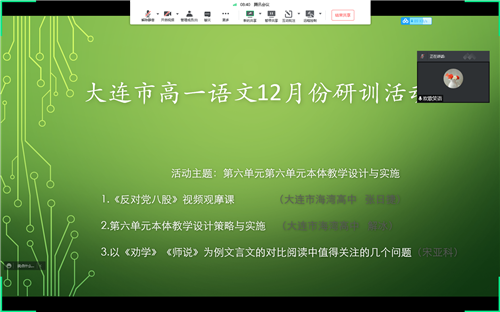 活動(dòng)包括三個(gè)部分的內(nèi)容。首先由播放了由大連市海灣高中張日捷老師執(zhí)教的“《反對(duì)黨八股》”觀摩課。這節(jié)課是第六單11課中的一篇,從論說文的知識(shí)為主,以文本特征入手,以三個(gè)學(xué)習(xí)任務(wù)活動(dòng)為學(xué)習(xí)支架,系統(tǒng)地講解了這篇課文的論證思路、論證方法和語(yǔ)言特色,整個(gè)課程從閱讀到寫作,完成了從思辨地提升與落實(shí)這個(gè)過程。本課獲得了國(guó)家基礎(chǔ)教育精品課的省優(yōu)。然后大連市海灣高中高一備課組解冰老師做了題為“第六單元整體教學(xué)設(shè)計(jì)策略與實(shí)施”的講座。講座從理論探索、具體實(shí)施策略兩個(gè)方面展開,結(jié)合思辨性閱讀與寫作這個(gè)學(xué)習(xí)任務(wù)群的教學(xué)理念,闡述了本單元在提升思辨能力的重要性。然后結(jié)合自己學(xué)習(xí)具體的課例分析,重點(diǎn)介紹了實(shí)施策略。講座中解老師聯(lián)系自己學(xué)校學(xué)生的特點(diǎn),注重學(xué)習(xí)的主體性,關(guān)注學(xué)生的思辨性學(xué)習(xí)與寫作,講座給了基層學(xué)校開展思辨性閱讀與寫作這個(gè)單元以啟示。最后研訓(xùn)教師宋亞科做了題為“以《勸學(xué)》《師說》為例文言文的對(duì)比閱讀中值得關(guān)注的幾個(gè)問題”的主題講座。講座中,宋老師從課程標(biāo)準(zhǔn)、教材、學(xué)生和作品四個(gè)層面,分析了對(duì)比閱讀的必要性。然后結(jié)合《勸學(xué)》《師說》兩課文的對(duì)比閱讀設(shè)計(jì),從如何獲取比較點(diǎn)的最優(yōu)值、如何做到言文不分的有機(jī)統(tǒng)一、主題的探究要發(fā)而重啟、思辨性的再批判、如何設(shè)計(jì)與之相適應(yīng)的練習(xí)題等五個(gè)問題進(jìn)行了分析,提出了相應(yīng)的策略和方法。