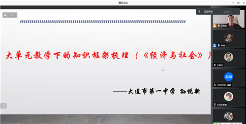 活動首先是大連市第十三中學(xué)唐絮穎老師做必修1《中國特色社會主》教材必備知識的梳理及分析,唐老師從新高考的考查理念入手,簡述了必備知識在高考評價體系中的地位和作用,以課標為指導(dǎo),詳細梳理了四課的必備知識,并強調(diào)在教學(xué)中堅持價值引領(lǐng),落實單元教學(xué)。其次是大連市第一中學(xué)孫悅新老師對必修2《經(jīng)濟與社會》進行了必備知識的梳理與分析,孫老師從大單元教學(xué)的概念入手,概述了大單元教學(xué)在必修二的體現(xiàn),解析了兩個單元的邏輯關(guān)系,用知識框架圖的方式具體梳理了必備知識點,并以2021年遼寧高考題為例,說明了大單元教學(xué)在高考中的應(yīng)用。最后羅老師對兩位老師的發(fā)言及復(fù)課后的教學(xué)情況進行了總結(jié),強調(diào)老師們在教學(xué)任務(wù)繁重、課時非常緊缺的情況下,更要加強備課,抓好基礎(chǔ),做好復(fù)習(xí),讓學(xué)生們有準備地參加期末考試。