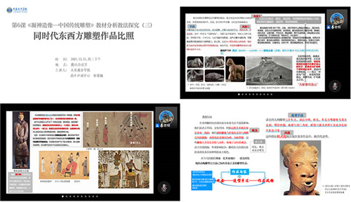 繼10月(一)“文化觀念與造像樣式”、11月“(二)石窟彩塑與摩崖造像”研訓(xùn)之后,12月研訓(xùn)內(nèi)容是“(三)中國傳統(tǒng)雕塑與同時(shí)期外國雕塑比照分析”,連續(xù)三個(gè)月研訓(xùn)活動都以中國美術(shù)鑒賞《凝神造像——中國傳統(tǒng)雕塑》為基礎(chǔ)從三個(gè)不同的方面對該課程內(nèi)容進(jìn)行更深入更透徹的分析,目的只有一個(gè),幫助一線老師更好地學(xué)習(xí)、理解教材和其相關(guān)的作品及其背后的觀念與環(huán)境。促使老師們用學(xué)科核心素養(yǎng)指導(dǎo)分析教材、設(shè)計(jì)教學(xué),將學(xué)習(xí)新教材,落實(shí)新課標(biāo)扎實(shí)脫實(shí)到課堂教學(xué)中。