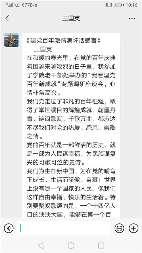 調(diào)研中,通過集體研討、座談交流、專題訪談、故事征集及主題征文等途徑,多措并舉、多維互動(dòng),充分引導(dǎo)老干部以積極的態(tài)度,飽滿的熱情參與到活動(dòng)中。先后開放“黨史微講堂”、開展了“黨史學(xué)習(xí)教育”黨日主題活動(dòng)、“我看建黨百年新成就”主題座談會(huì)、“我在黨50年”專題訪談、“話幸福生活•頌黨的恩情”主題征文等一系列活動(dòng)。老黨員、老教授、老教師們從親身經(jīng)歷、工作變化、生活環(huán)境等多方面暢所欲言,話真實(shí)變化、談?wù)媲懈惺堋①潅ゴ蟪删汀K麄兗娂姼袊@黨的百年巨變,是偉大的黨不斷進(jìn)行實(shí)踐創(chuàng)新和理論創(chuàng)新,實(shí)現(xiàn)了中國人民從站起來、富起來到強(qiáng)起來的偉大飛躍;感恩黨的百年輝煌,是矢志踐行初心使命的一百年,是篳路藍(lán)縷奠基立業(yè)的一百年;感謝黨的百年哺育,百年櫛風(fēng)沐雨,紅色江山來之不易,是千千萬萬革命前輩用鮮血和生命換來今天老同志們的幸福晚年生活。劉國男教授深情回顧了我黨建黨之初經(jīng)歷的艱難困苦,講述了共產(chǎn)黨締造新中國、捍衛(wèi)新中國、建設(shè)新中國、發(fā)展新中國的偉大歷程,感嘆到“沒有共產(chǎn)黨就沒有新中國,只有共產(chǎn)黨才能帶領(lǐng)全國人民走向繁榮富強(qiáng)!”退休鄭力教授結(jié)合自己的親身經(jīng)歷,贊美了在黨的領(lǐng)導(dǎo)下大連“兩先區(qū)”高質(zhì)量發(fā)展、助力鄉(xiāng)村振興等方面取得的顯著成就。表示新時(shí)代的我們,唯有不改初心本色,勇?lián)鷼v史重任,才能綻放最美“夕陽紅”。耄耋之年的退休教師王國英深情地說到:“我們黨走過了非凡的百年征程,取得了舉世矚目的輝煌成就,翰墨丹青、詩詞歌賦、千歌萬曲,都表達(dá)不盡我們對(duì)黨的熱愛、感恩、崇敬之情。我為生在新中國,為在黨的哺育下成長、生活而驕傲、自豪!世界上沒有哪一個(gè)國家的人民,像我們這樣自由幸福,快樂的生活著。”有著71年黨齡的離休干部韓一斌激動(dòng)不已地說;“頻頻傳來的我國偉大成就的喜訊,常使我激動(dòng)得夜不能寐,我做夢也想不到我能趕上這樣的好時(shí)代。我一直享受著豐厚的待遇,醫(yī)療上實(shí)報(bào)實(shí)銷。學(xué)院離退休干部處有專人為我提供周到貼心的服務(wù),他們工作的熱度、溫度、態(tài)度讓我很感動(dòng)。市委老干部局還設(shè)有老干部活動(dòng)室和老干部大學(xué)。老有所養(yǎng)、老有所學(xué)、老有所樂,這些都是黨對(duì)我無微不至的關(guān)懷。所以我晚年生活很幸福、很滿足。我身在福中很知福,感謝黨的好領(lǐng)導(dǎo)!”