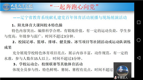 本次教研對2021年大連市普通高中《體育與健康》學科的各項工作再次進行梳理,并進行了深入的解讀,2021年恰逢中國共產(chǎn)黨建黨百年,在系列慶祝活動中各校要結(jié)合本校實際,周密組織、精心設(shè)計,突出時代特這,創(chuàng)新活動形式和內(nèi)容,為中國共產(chǎn)黨成立100周年獻禮。