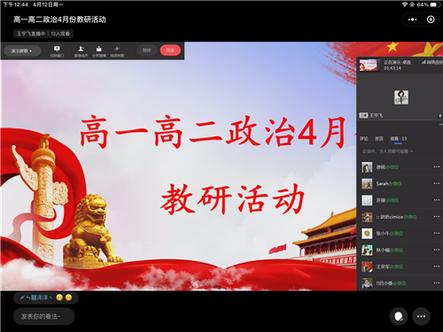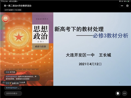 “教而不研則愚,研而不教則虛。”教與研是相互依托、相互促進(jìn)的,教研活動(dòng)是教學(xué)當(dāng)中的重要環(huán)節(jié),是教學(xué)的另一種關(guān)鍵形式。為了更好地提高教育科研水平,促進(jìn)教師專業(yè)化成長(zhǎng),2021年4月12日下午一點(diǎn),大連市高一高二思政課教師齊聚云端,召開“新高考下的教材處理”主題教研活動(dòng)。活動(dòng)由大連教育學(xué)院高中研訓(xùn)中心政治研訓(xùn)教師唐銘主持。