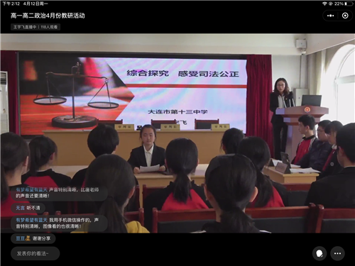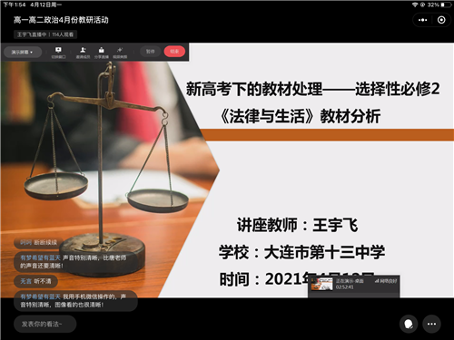 本次活動(dòng)分三個(gè)環(huán)節(jié),首先是由唐銘老師對(duì)本學(xué)期的教學(xué)計(jì)劃、進(jìn)度安排、教學(xué)內(nèi)容等方面進(jìn)行分析解讀,為一線政治課教師提供教學(xué)參考和方向指引。第二環(huán)節(jié)是三位老師的對(duì)教材的解讀與分享,大連市開發(fā)區(qū)一中的王長(zhǎng)城老師從教材的基本理念、教材整體架構(gòu)、教材的使用原則、教師備課建議四個(gè)方面對(duì)必修3《政治與法治》進(jìn)行細(xì)致解讀;大連市第二十四中學(xué)的卞麗萍老師對(duì)選擇性必修1《當(dāng)代國(guó)際政治與經(jīng)濟(jì)》教材進(jìn)行分析,對(duì)照新課標(biāo)要求從考點(diǎn)知識(shí)梳理(基礎(chǔ)性)、知識(shí)歸納升華(綜合性)、學(xué)以致用探究試題(應(yīng)用性)三個(gè)方面對(duì)教材進(jìn)行介紹和解讀;大連市第十三中學(xué)王宇飛老師宏觀上解讀了選擇性必修2《法律與生活》教材的結(jié)構(gòu)和框架,并依據(jù)《普通高中思想政治課程標(biāo)準(zhǔn)》(2017年版2020年修訂)和《教師教學(xué)用書》總結(jié)概括出本冊(cè)教材的重難點(diǎn),最后把在教學(xué)中的經(jīng)驗(yàn)進(jìn)行分享,此外,還展示了活動(dòng)型課程的教學(xué)課例《感受司法公正》。最后,唐銘老師對(duì)三位老師的發(fā)言做出了精彩點(diǎn)評(píng),希望各位老師能深入學(xué)習(xí)好的方法和經(jīng)驗(yàn),強(qiáng)調(diào)要用好“大思政課”,要把校園生活與社會(huì)生活銜接起來,把“思政小課堂”與“社會(huì)大課堂”結(jié)合起來,把學(xué)科邏輯與實(shí)踐邏輯聯(lián)系起來,把理論知識(shí)與生活關(guān)切融合起來,聚焦政治學(xué)科核心素養(yǎng),落實(shí)立德樹人根本任務(wù),發(fā)揮高中思政課獨(dú)特的育人作用。