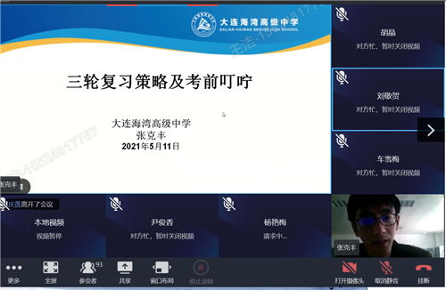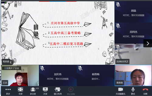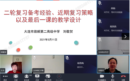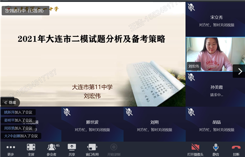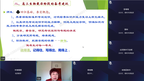 此次線上活動具體安排了三大方面內(nèi)容:首先由命題組成員-11中的劉宏偉老師做二模生物試題分析及備考策略的講座,隨后莊河五高中高三備課組長葛艷艷老師、旅順二高中高三備課組長劉敬賀老師、海灣高中高三備課組長張克豐老師分別代表各層次學(xué)校做最后階段的備考策略及最后一課的備考設(shè)計(jì)(思路)的講座,最后研訓(xùn)教師王潔做二模生物試卷分析及最后階段的備考建議的講座。
