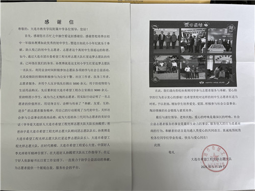 6月1日,學(xué)院附中收到一封來(lái)自大連市希望工程光祥志愿大隊(duì)紅星追夢(mèng)志愿隊(duì)的感謝信,信中對(duì)我校初一一班孫奧博同學(xué)的愛(ài)心助學(xué)事跡表示感謝。