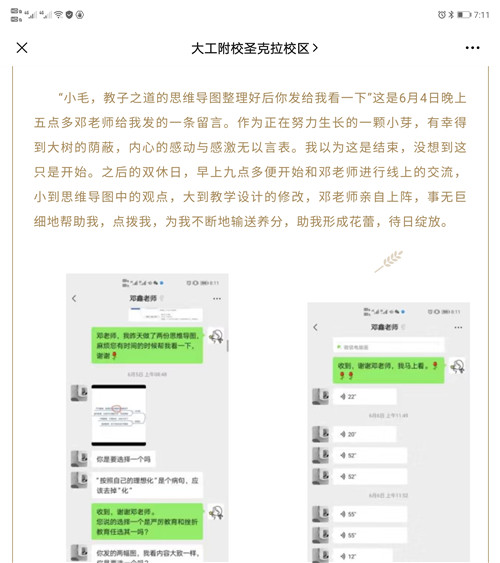 為了短時(shí)高效地完成本次任務(wù),充分展示大連區(qū)域整本書(shū)閱讀的理念和策略,接到活動(dòng)通知后,鄧鑫老師第一時(shí)間聯(lián)系學(xué)校,明確籌備內(nèi)容及工作節(jié)奏。針對(duì)網(wǎng)上直播需要的技術(shù)支撐,鄧?yán)蠋熂皶r(shí)建立上海、大連兩地技術(shù)人員交流群,以便為線(xiàn)上直播提供可靠的技術(shù)保障。面對(duì)學(xué)校臨時(shí)更換執(zhí)教教師的變故,鄧?yán)蠋煼e極給予學(xué)科專(zhuān)業(yè)指導(dǎo),分別于6月2日、4日,深入圣克拉校區(qū)聽(tīng)評(píng)課,大到整本書(shū)閱讀的實(shí)施理念、本節(jié)課的架構(gòu)環(huán)節(jié)、學(xué)生課堂生成的預(yù)設(shè)、教師應(yīng)對(duì)的技巧,小到毛老師教學(xué)設(shè)計(jì)中的語(yǔ)法錯(cuò)誤,鄧?yán)蠋煻家灰唤o予指導(dǎo)和訂正。