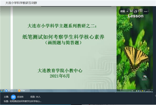 2021年6月10日下午,大連市小學(xué)科學(xué)學(xué)科主題系列教研活動(dòng)“基于核心素養(yǎng)形成的學(xué)業(yè)質(zhì)量評價(jià)研究”之二“紙筆測試(簡答題、畫圖題)如何考查學(xué)生科學(xué)核心素養(yǎng)”在釘釘平臺(tái)以網(wǎng)絡(luò)教研的形式順利召開。