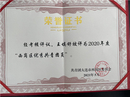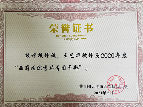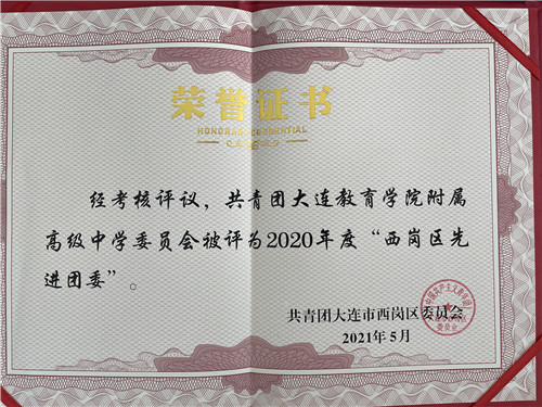 共青團(tuán)大連教育學(xué)院附屬高級中學(xué)委員會被評為2020年度大連市五四紅旗團(tuán)支部、“西崗區(qū)先進(jìn)團(tuán)委”;學(xué)校團(tuán)支部書記王藝燁被評為2020年度“西崗區(qū)優(yōu)秀共青團(tuán)干部”;王填舒同學(xué)被評為2020年度“西崗區(qū)優(yōu)秀共青團(tuán)員”。