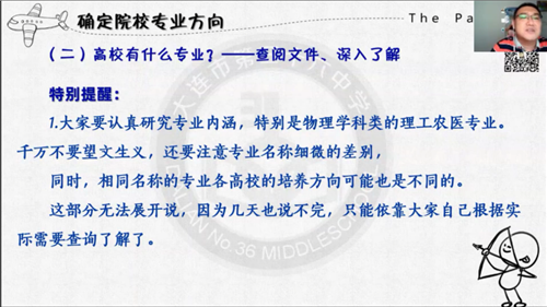 活動(dòng)首先由生涯規(guī)劃師、高考報(bào)考專(zhuān)家范兆宗老師結(jié)合2021年遼寧志愿填報(bào)政策,為大家講解了平行志愿投檔規(guī)則、如何科學(xué)挑選大學(xué)和專(zhuān)業(yè)、新高考志愿的思路和技巧。然后,大連市第三十六中學(xué)歷史老師,中、高考志愿填報(bào)研究專(zhuān)家劉世陽(yáng)老師為大家?guī)?lái)《“零距離”解析高考志愿填報(bào)技巧與規(guī)則》主題演講,劉老師通過(guò)確定院校專(zhuān)業(yè)方向、整理高校錄取數(shù)據(jù)、了解志愿填報(bào)規(guī)則、確定最終志愿方案等高報(bào)“四步走”內(nèi)容一一展開(kāi)陳述,詳細(xì)解讀新高考帶來(lái)的諸多變化,在面對(duì)全新的“3+1+2”“專(zhuān)業(yè)(類(lèi))+學(xué)校”模式以及較多的志愿填報(bào)數(shù)量,如何科學(xué)判斷自身高考成績(jī)或位次被所填報(bào)志愿錄取可能性。