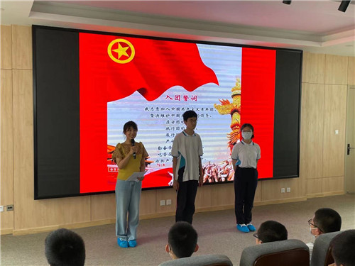 第二項是初二學(xué)生劉語桐、徐智涵兩名新團員的入團儀式。兩名同學(xué)在團旗下莊嚴宣誓,立志做一名優(yōu)秀的共青團員,努力學(xué)習(xí),做品學(xué)兼優(yōu)的好學(xué)生,以優(yōu)秀的成績回報老師、回報學(xué)校、回報祖國、回報社會。