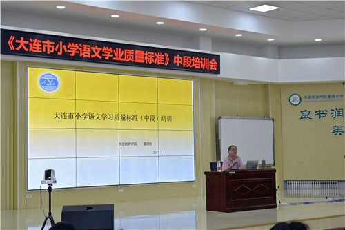 本次培訓活動由夏德剛老師主講,講座主要分為兩大部分,一部分是課程內(nèi)容與示例,分為三年級上學期、下學期,四年級上學期、下學期,包括識字與寫字、閱讀、習作、口語交際、綜合性學習五個大方面;另一部分是評價方式與評價示例。夏老師結(jié)合《大連市語文學業(yè)質(zhì)量標準》生動形象、深入淺出地講解,使與會教師受益匪淺。