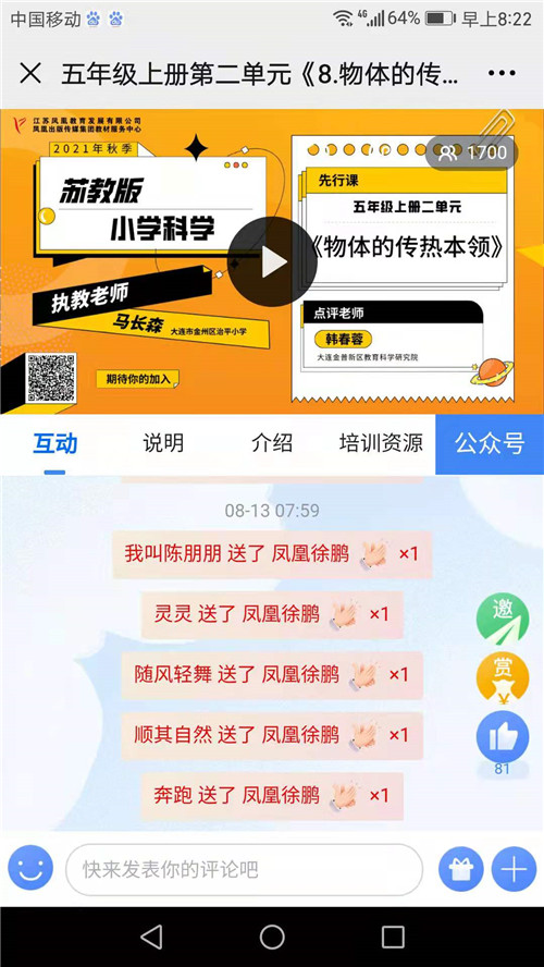 在先行課中,精選播放了八位試教老師錄制的五年級、六年級上冊先行課,同時邀請《科學》教材編寫組專家、教研員、該學科領(lǐng)域?qū)<疫M行了點評。其中,五年級上冊先行課由大連市科學教師授課,區(qū)域教研員進行先行課點評。金普新區(qū)省科學骨干教師星河小學李耀峰執(zhí)教《熱傳導(dǎo)》、金普新區(qū)科學教研員韓春蓉老師進行點評;大連市科學骨干教師瓦房店老虎屯小學徐佳磊執(zhí)教《熱對流》、瓦房店科學教研員鄒積鵬老師進行點評;大連市科學骨干教師甘井子區(qū)鵬輝小學于百春執(zhí)教《熱輻射》,甘井子區(qū)科學教研員孫強老師進行點評;金普新區(qū)省科學骨干教師治平小學馬長森執(zhí)教《物體的傳熱本領(lǐng)》,金普新區(qū)科學教研員韓春蓉老師進行點評。通過先行課的示范、點評,培訓教師大開眼界,見識到了高水平的科學課是什么樣的,領(lǐng)略到舉重若輕、游刃有余的名師風采,也為老師們使用新教材提供了有借鑒意義的范例。