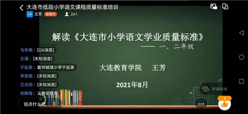 8月26日上午,大連教育學(xué)院小學(xué)研訓(xùn)中心語文教研員王芳老師,利用釘釘平臺(tái)做了主題為《解讀<大連市小學(xué)語文學(xué)業(yè)質(zhì)量標(biāo)準(zhǔn)>》專題講座。瓦房店市語文教研員程海鷗老師和358名低段語文教師參加了本次培訓(xùn),培訓(xùn)效果明顯。