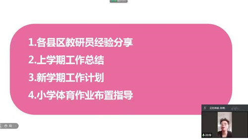 本次活動(dòng)由大連教育學(xué)院小學(xué)研訓(xùn)中心體育教研員孫萍老師主持,活動(dòng)由“各縣區(qū)教研員經(jīng)驗(yàn)分享、上學(xué)期工作總結(jié)、新學(xué)期工作計(jì)劃、課后體育作業(yè)布置指導(dǎo)”四部分組成。活動(dòng)伊始,各區(qū)教研員針對(duì)上學(xué)期體育研訓(xùn)工作的優(yōu)勢(shì)及不足展開充分地交流,各縣市區(qū)相互學(xué)習(xí)、取長(zhǎng)補(bǔ)短。而后,孫萍老師歸納、總結(jié)了大連市小學(xué)體育學(xué)科上學(xué)期的工作情況并進(jìn)行了新學(xué)期工作安排,重點(diǎn)對(duì)課后體育作業(yè)布置進(jìn)行了細(xì)致的指導(dǎo),要求各區(qū)進(jìn)行二次培訓(xùn),高度重視課后體育作業(yè)的實(shí)施。
