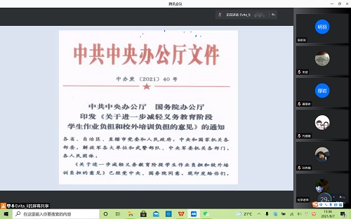 在本次活動中,李娟老師帶領(lǐng)老師們針對"中共中央辦公廳國務(wù)院辦公廳印發(fā)《關(guān)于進(jìn)一步減輕義務(wù)教育階段學(xué)生作業(yè)負(fù)擔(dān)和校外培訓(xùn)負(fù)擔(dān)的意見》"進(jìn)行了學(xué)習(xí)和解讀。