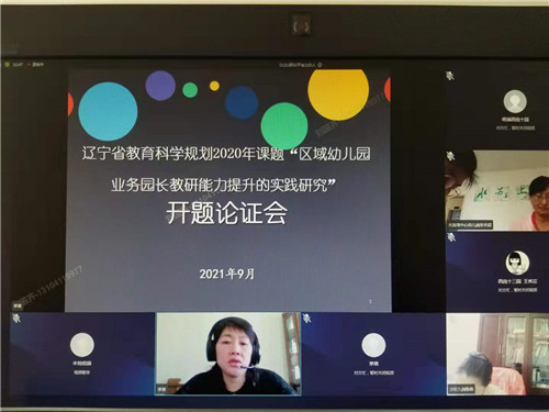 2021年9月14日下午,遼寧省教育科學(xué)規(guī)劃2020年度課題《區(qū)域幼兒園業(yè)務(wù)園長教研能力提升的實踐研究》順利召開線上開題論證會。出席會議的有課題指導(dǎo)專家、遼寧教育學(xué)院基礎(chǔ)教育教學(xué)研究中心學(xué)前教研部副部長孫英敏,課題主持人、大連教育學(xué)院學(xué)前研訓(xùn)中心教研員茅茵和學(xué)前研訓(xùn)中心教研員趙宇、邵日芳,課題組成員及大連市四星級幼兒園業(yè)務(wù)園長近60人在線上參加會議。