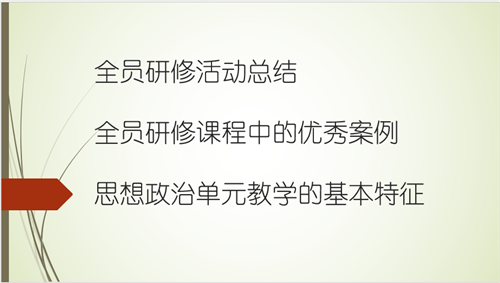 活動共有兩項內(nèi)容。第一項內(nèi)容是大連市第十二中學(xué)趙春雪老師做思想政治必修一《中國特色社會主義》的教材分析,趙老師站在課標(biāo)的高度對整個教材進(jìn)行了具體解讀,闡釋了各部分內(nèi)容的內(nèi)在邏輯關(guān)系,并分享了教學(xué)策略及自己親身實踐的教學(xué)案例,令老師們豁然開朗,深受啟發(fā)。第二項內(nèi)容是羅萍老師進(jìn)行總結(jié)和指導(dǎo)。在前期調(diào)研的基礎(chǔ)上,羅老師首先對暑假期間進(jìn)行的全員研修情況進(jìn)行了簡要總結(jié),匯總了老師們對通識課程和學(xué)科課程中感受非常深刻的報告,并提醒老師一定要在規(guī)定時間內(nèi)完成研修;其次例舉了研修課程中非常優(yōu)秀、具有借鑒意義的教學(xué)設(shè)計案例,希望老師們能再次深入學(xué)習(xí)并運用在教學(xué)實踐中;再次,結(jié)合研修課程中的報告,帶領(lǐng)老師們再一次深刻學(xué)習(xí)了思想政治單元教學(xué)的基本特征。