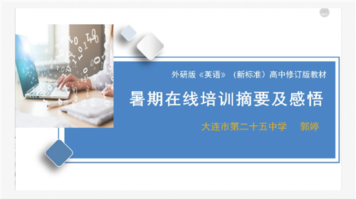 此外,大連市第二十五中學(xué)的郭婷老師做了《暑期在線培訓(xùn)摘要與感悟》的講座,她對(duì)今年暑期外研社組織的兩天12小時(shí)的培訓(xùn)內(nèi)容刪繁就簡(jiǎn),綱舉目張地進(jìn)行了提煉、分析和解讀,使得老師們對(duì)整個(gè)暑期培訓(xùn)的內(nèi)容有了更全面和更深入的理解。