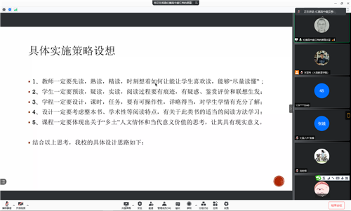 活動包括三個部分的內(nèi)容。首先由播放了由大連24中王丹老師執(zhí)教的“奇文共欣賞、疑義相與析”觀摩課。這節(jié)課是第一單元最后的整合課和拓展課,試圖讓學生通過第一單元的學習,運用“意象”欣賞的手法,去拓展現(xiàn)代詩歌的閱讀。然后大連市莊河高級中學高一備課組宋辰光老師對這節(jié)課進行了評課。評課過程中,宋老師對本節(jié)課的設(shè)計亮點、學習活動設(shè)計進行了總結(jié)與評價,對學生在學習活動中的審美能力的發(fā)展重點進行了剖析。最后,大連市紅旗高中盛江偉老師做了題為“整本書閱讀教學推進策略”講座。講座從理論探索、具體實施策略兩個方面展開,結(jié)合目前國內(nèi)整本書閱讀與研討這個學習任務(wù)群的教學理念與優(yōu)秀案例,闡述了整本書閱讀教學中應(yīng)該注意的問題。然后結(jié)合自己學習《鄉(xiāng)土中國》整本書的閱讀,重點介紹了實施策略:教師一定要先讀,熟讀,精讀,時刻想著如何讓能讓學生喜歡讀,能夠“盡量讀懂”;學生一定要預讀,疑讀,實讀,閱讀過程要有痕跡,有疑惑、鑒賞評價和聯(lián)想生發(fā);學程一定要設(shè)計,課時,任務(wù),要有可操作性,詳略得當,對學生學情有充分了解;設(shè)計--定要考慮整本書、學術(shù)性等閱讀特點,有關(guān)于此類書的適當?shù)拈喿x方法學習;課程一定要體現(xiàn)出關(guān)于“鄉(xiāng)土”人文情懷和當代意義價值的思考,讓其具有現(xiàn)實意義。在實施策略的介紹中,盛老師結(jié)合自己學校學生的閱讀真實案例,強調(diào)了師生共讀、注重學生閱讀方法的養(yǎng)成。