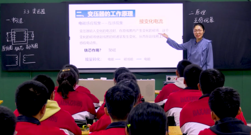 大連經(jīng)濟(jì)開(kāi)發(fā)區(qū)第八高中的丁玥老師上了《變壓器》一課。她通過(guò)生活中電源電壓是220伏,如何滿足日常用電器的各種不同電壓需求?引入變壓器。讓學(xué)生動(dòng)手拆解變壓器,了解變壓器的構(gòu)造,認(rèn)識(shí)變壓器的工作原理,利用多用電表的交流檔測(cè)變化器的輸出電壓,通過(guò)實(shí)驗(yàn)探究,找到變壓器的電壓變化規(guī)律。特別是用傳感器探究輸出電壓與輸入電壓的關(guān)系,能夠直觀地看到輸入與輸出都是正弦交流電,它們的周期與頻率相同,理解平時(shí)所說(shuō)的交流電壓是有效值,這是本課亮點(diǎn)之一。課堂鞏固練習(xí)能夠聯(lián)系實(shí)際,用所學(xué)知識(shí)解決生活常見(jiàn)的問(wèn)題,學(xué)以致用。
