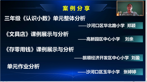 本次活動由大連教育學院小學研訓中心數(shù)學教研員劉稀鳳主持,活動內(nèi)容主要以三年級上冊《認識小數(shù)》單元為例,探索單元主題下如何結(jié)構(gòu)化的進行單元整體分析、課堂教學設(shè)計與實施、單元作業(yè)設(shè)計,確保學教評的一致性。活動中,首先由鄭穎小學數(shù)學名師工作室主持人及成員做案例交流,其中,沙河口區(qū)華北路小學鄭穎老師做《認識小數(shù)》單元整體分析交流,高新區(qū)中心小學劉余老師和旅順經(jīng)濟開發(fā)區(qū)中心小學劉盈老師分別展示《文具店》《存零用錢》兩節(jié)課例,呈現(xiàn)如何從單元整體教學設(shè)計出發(fā),在課堂教學中實現(xiàn)知識的結(jié)構(gòu)化。沙河口區(qū)玉華小學張婷婷老師,分享了單元作業(yè)分析。最后,劉稀鳳老師結(jié)合本次教研主題從外在形式的結(jié)構(gòu)化、內(nèi)在內(nèi)涵的結(jié)構(gòu)化,兩方面對單元主題教學如何結(jié)構(gòu)化實施,才能幫助學生構(gòu)建體現(xiàn)學科本質(zhì)的結(jié)構(gòu)化知識體系進行培訓指導,提出實施建議。