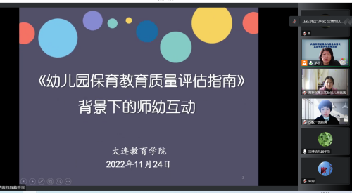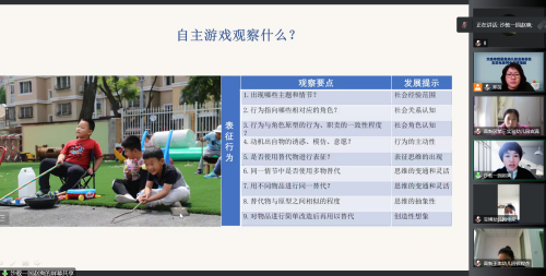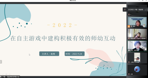 根據(jù)疫情防控要求,本次教研活動采取線上活動的方式進行,活動中,首先由全國優(yōu)秀游戲案例獲者—沙河口區(qū)教師幼兒園趙爽老師進行了主題為《在自主游戲中建構(gòu)積極有效的師幼互動》的專題培訓(xùn)。趙爽老師將《評估指南》的理念與工作實踐結(jié)合,從觀察與評價、材料的投放、支持與拓展及課程創(chuàng)生四個方面展開闡述了建立高質(zhì)量師幼互動的具體方法。