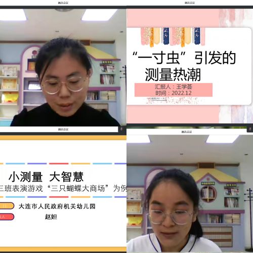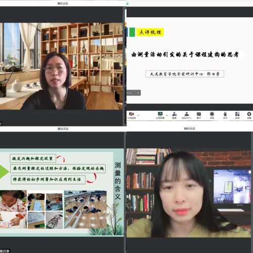 活動(dòng)采用騰訊會(huì)議線上形式開展,由案例分享、專題培訓(xùn)、點(diǎn)評梳理三部分組成。兩位基地園所研究老師做《由“一寸蟲”引發(fā)的測量熱潮》《小測量、大智慧——以大三班表演游戲“三只蝴蝶大商場”為例》專題案例分享,大連市政府機(jī)關(guān)幼兒園負(fù)責(zé)人做《從測量活動(dòng)中看兒童的深度學(xué)習(xí)》專題培訓(xùn),最后研訓(xùn)教師做《由測量活動(dòng)引發(fā)的關(guān)于課程建構(gòu)的思考》專題點(diǎn)評。