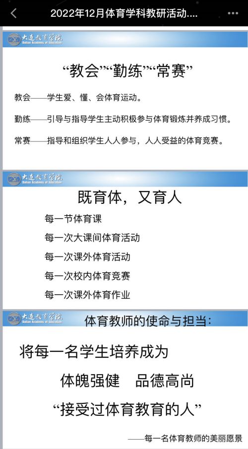 2022年12月6日,大連市高中體育與健康學(xué)科全員培訓(xùn)暨12月份研訓(xùn)活動(dòng)通過騰訊會(huì)議順利進(jìn)行。活動(dòng)由大連教育學(xué)院高中研訓(xùn)中心體育與健康研訓(xùn)教師陳立鵬主持。
