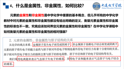 劉化毅老師在本次活動(dòng)中做了《“雙新”背景下的化學(xué)學(xué)科理解(4)》的系列講座,針對(duì)本學(xué)期的教學(xué)任務(wù)——必修第一冊(cè)教材第四章原子結(jié)構(gòu)與元素周期律部分進(jìn)行了剖析。通過分析高考試題的變化與命題特點(diǎn),劉老師與大家共同交流討論了新教材中副族的范圍、原子半徑如何變化、為什么金屬鉀的密度小于金屬鈉、什么是金屬性、非金屬性,如何比較、氯化鈉為何能阻止氫氧化鎂薄膜的作用、氫氧化鋁溶液顯酸性還是堿性等等老師們?cè)谌粘=虒W(xué)中遇到的疑難問題,結(jié)合搜集、查閱、整理的相關(guān)文獻(xiàn)與老師們進(jìn)行了分享,為加深學(xué)科理解,提升學(xué)生的知識(shí)、技能、方法和素養(yǎng)的探索了有效路徑。