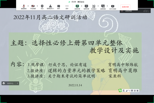 近日,高中研訓中心語文學科組研訓教師宋亞科利用騰訊會議,在線上組織了一次主題為“選擇性必修上冊第四單元整體教學設計及實施”的研訓活動。