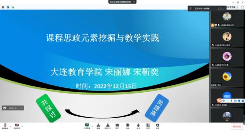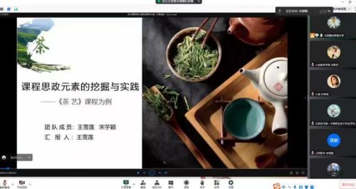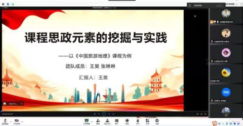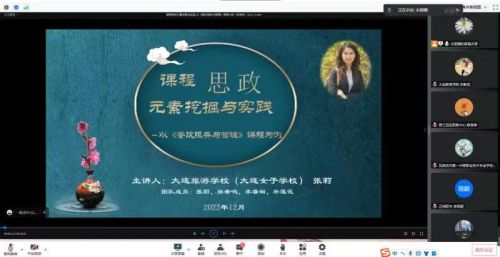 本次教研活動由研訓(xùn)教師宋麗娜、宋靳奕主持。首先,三門課程思政研究團隊做了經(jīng)驗分享,大連旅游學(xué)校(大連女子學(xué)校)王昊老師以《中國旅游地理》課程為例、大連商業(yè)學(xué)校王雪蓮老師以《茶藝》課程為例、大連旅游學(xué)校(大連女子學(xué)校)張莉以《餐飲服務(wù)與管理》課程為例,分別介紹了課程思政元素挖掘及其教學(xué)實踐的感悟。接著,宋麗娜老師對歷時一年半的課程思政政策理論研究和探究過程性成果進行了總結(jié)。